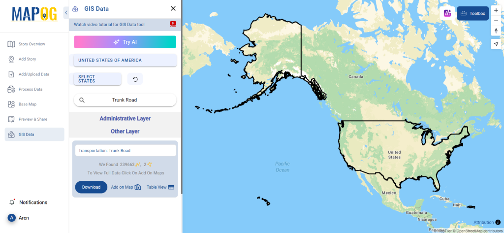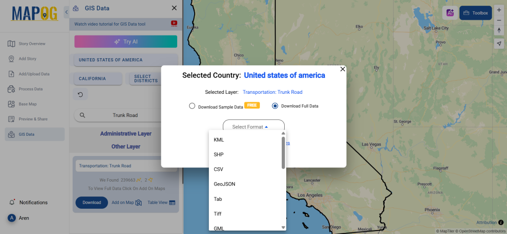 The Try AI feature simplifies the process. Just type the road data you need along with the region, and the AI tool will fetch the most relevant datasets.